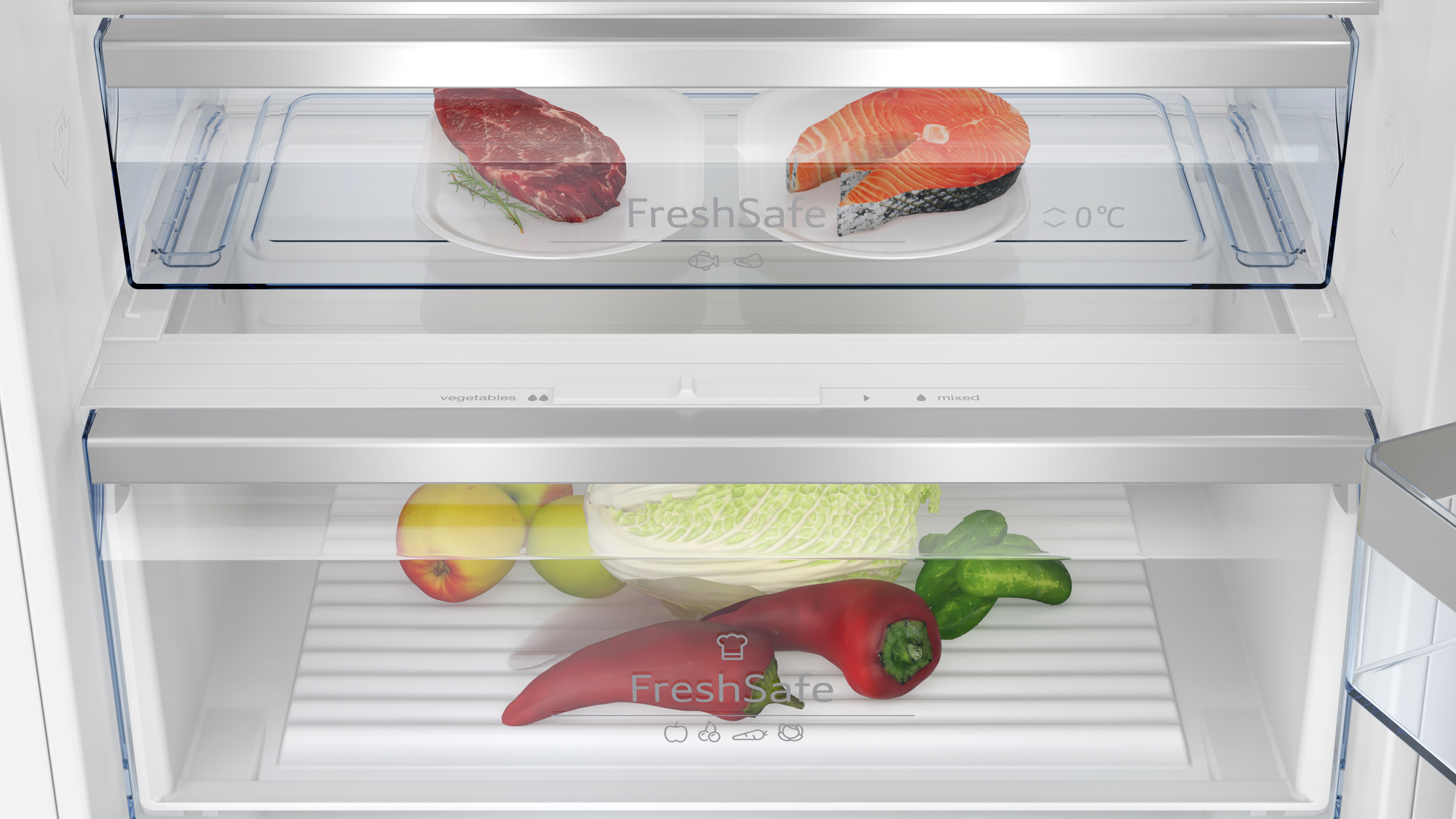 Il cassetto flessibile per frutta e verduta rende più facile il caricamento degli alimenti nel modo che preferisci. Anche carne e pesce ricevono un trattamento speciale grazie al cassetto dedicato con temperature più basse vicino a 0°.