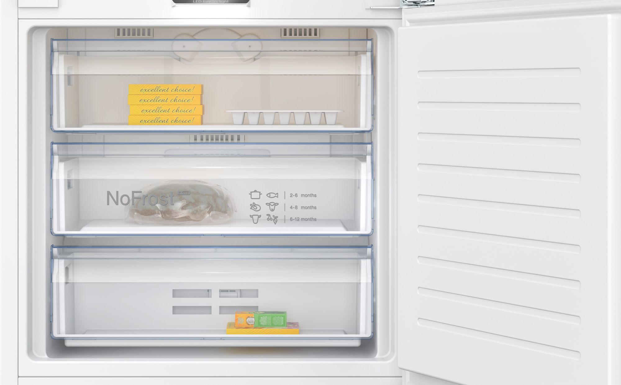Neff KB7966DD0. Capacità netta totale: 381 L. Cerniera porta: Destra. Classe climatica: SN-T, Emissione acustica: 33 dB. Capacità netta frigorifero: 284 L, No Frost (frigorifero), Luce interna, Numero di ripiani frigorifero: 4. Capacità netta congelatore: 98 L, Capacità di congelamento: 10 kg/24h, No Frost (congelatore). Compartimento zona fresca. Classe efficienza energetica: D, Consumo energetico annuo: 204 kWh. Colore del prodotto: Bianco