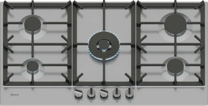Neff T29CIR8N0. Colore del prodotto: Nero, Acciaio inox, Posizionamento dell’apparecchio: Da incasso, Dimensione della larghezza del piano cottura: 90 cm. Tipo di controllo: Manopola, Posizione di controllo: Frontale superiore, Tipo di accensione elettronica: Accensione con manopola. Potenza aggregata (gas): 12500 W, Tensione di ingresso AC: 220-240 V, Frequenza di ingresso AC: 50 – 60 Hz. Tecnologie NEFF (cottura): FlameSelect®. Larghezza: 915 mm, Profondità: 520 mm, Altezza: 51,5 mm