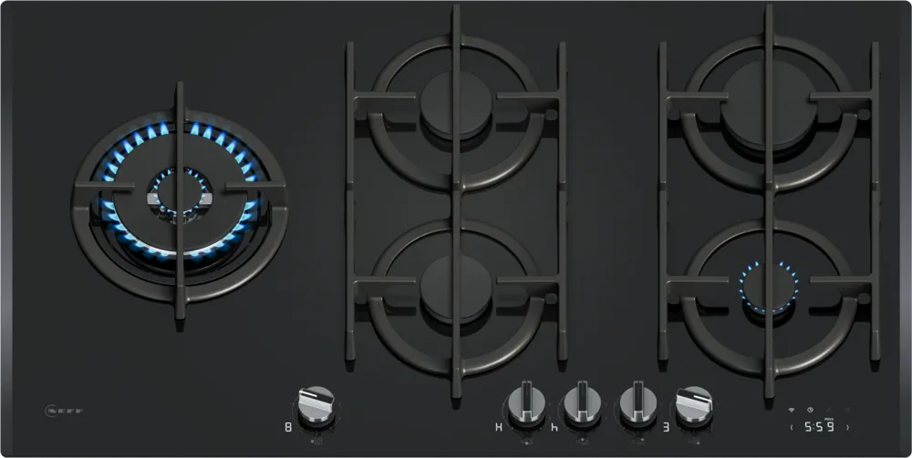Neff T29RHS4S0. Colore del prodotto: Nero, Posizionamento dell’apparecchio: Da incasso, Dimensione della larghezza del piano cottura: 90 cm. Tipo di controllo: Manopola, Posizione di controllo: Frontale, Tipo di display: LED. Potenza aggregata (gas): 13700 W, Tensione di ingresso AC: 220 – 240 V, Frequenza di ingresso AC: 50/60 Hz. Tecnologie NEFF (cottura): FlameSelect®, Home Connect. Larghezza: 915 mm, Profondità: 520 mm, Altezza: 54 mm