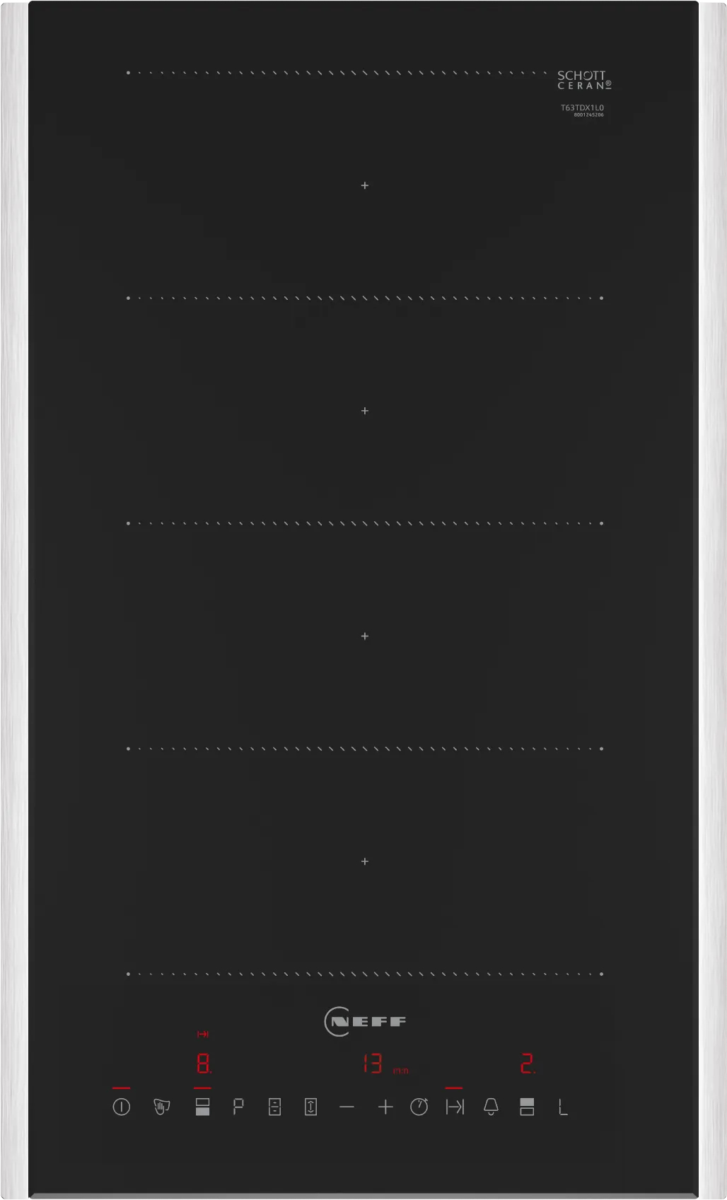 Neff N 70. Colore del prodotto: Nero, Acciaio inox, Posizionamento dell’apparecchio: Da incasso, Dimensione della larghezza del piano cottura: 30 cm. Tipo di controllo: Touch, Posizione di controllo: Frontale. Potenza aggregata (elettrica): 3700 W, Tensione di ingresso AC: 220 – 240 V. Larghezza: 319 mm, Profondità: 527 mm, Altezza: 51 mm. Larghezza imballo: 370 mm, Profondità imballo: 126 mm, Altezza imballo: 527 mm