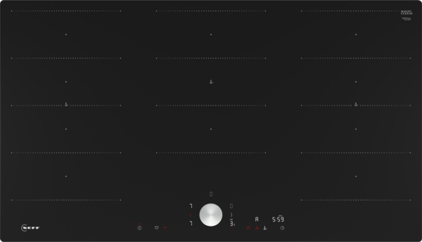 Neff T69PTX4L0. Colore del prodotto: Nero, Posizionamento dell’apparecchio: Da incasso, Dimensione della larghezza del piano cottura: 90 cm. Tipo di controllo: Manopola, Touch, Posizione di controllo: Frontale. Potenza aggregata (elettrica): 11100 W. Larghezza: 892 mm, Profondità: 512 mm, Altezza: 56 mm