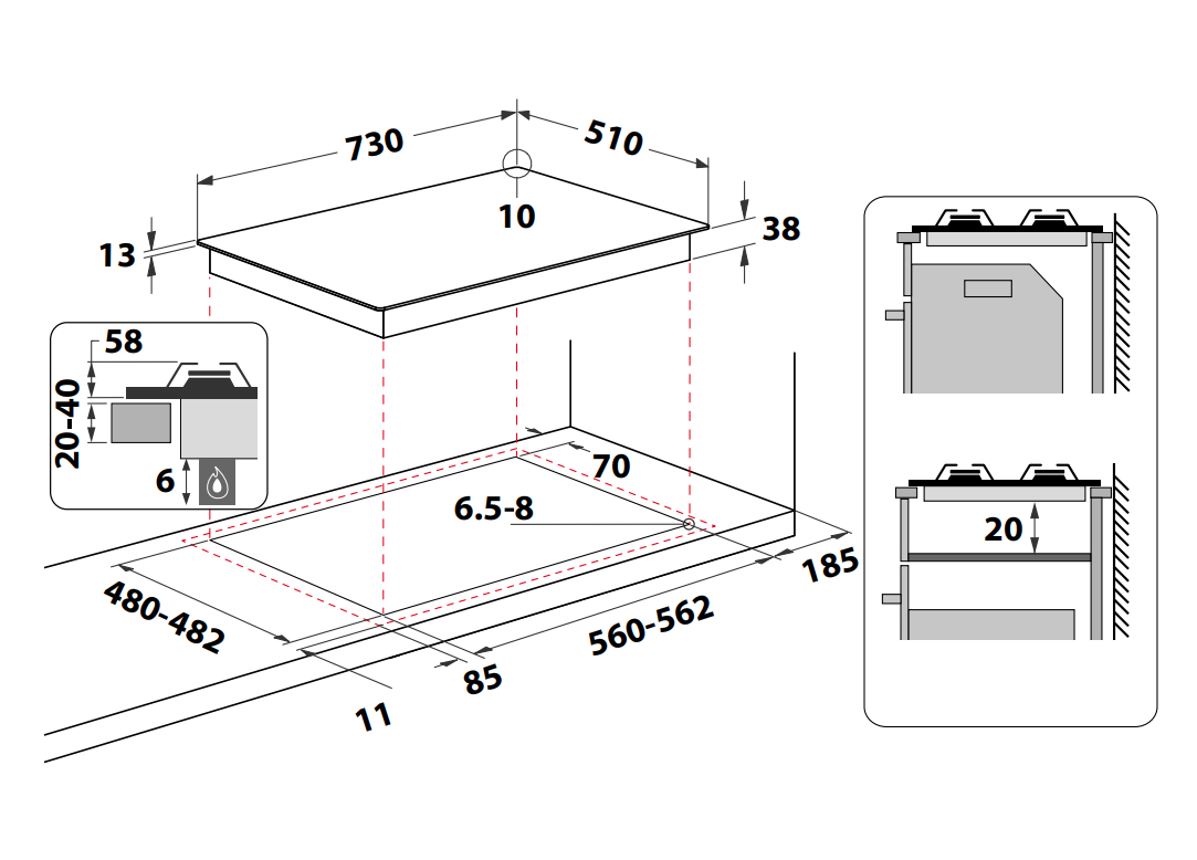 | Dimensione della larghezza del piano cottura (cm) | 73 | 73 | 68 |