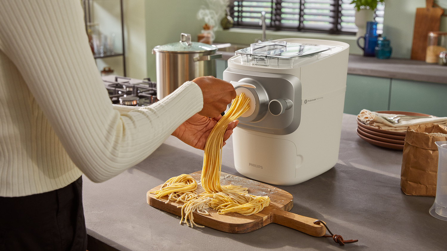 La macchina per pasta Philips 7000 ti aiuta a preparare una vasta gamma di gustosi piatti di pasta fatta in casa in meno di 10 minuti*. Grazie alla pulizia senza problemi e all’ampia capacità, è lo strumento ideale per gustare la pasta fresca con la famiglia e gli amici a casa in qualsiasi momento.