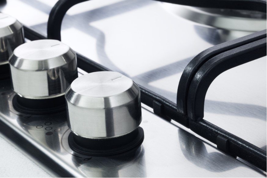 Piano a gas in acciaio inox 18/10 da 60 cm con quattro bruciatori a gas che includono un bruciatore ultrarapido e uno a tripla corona.