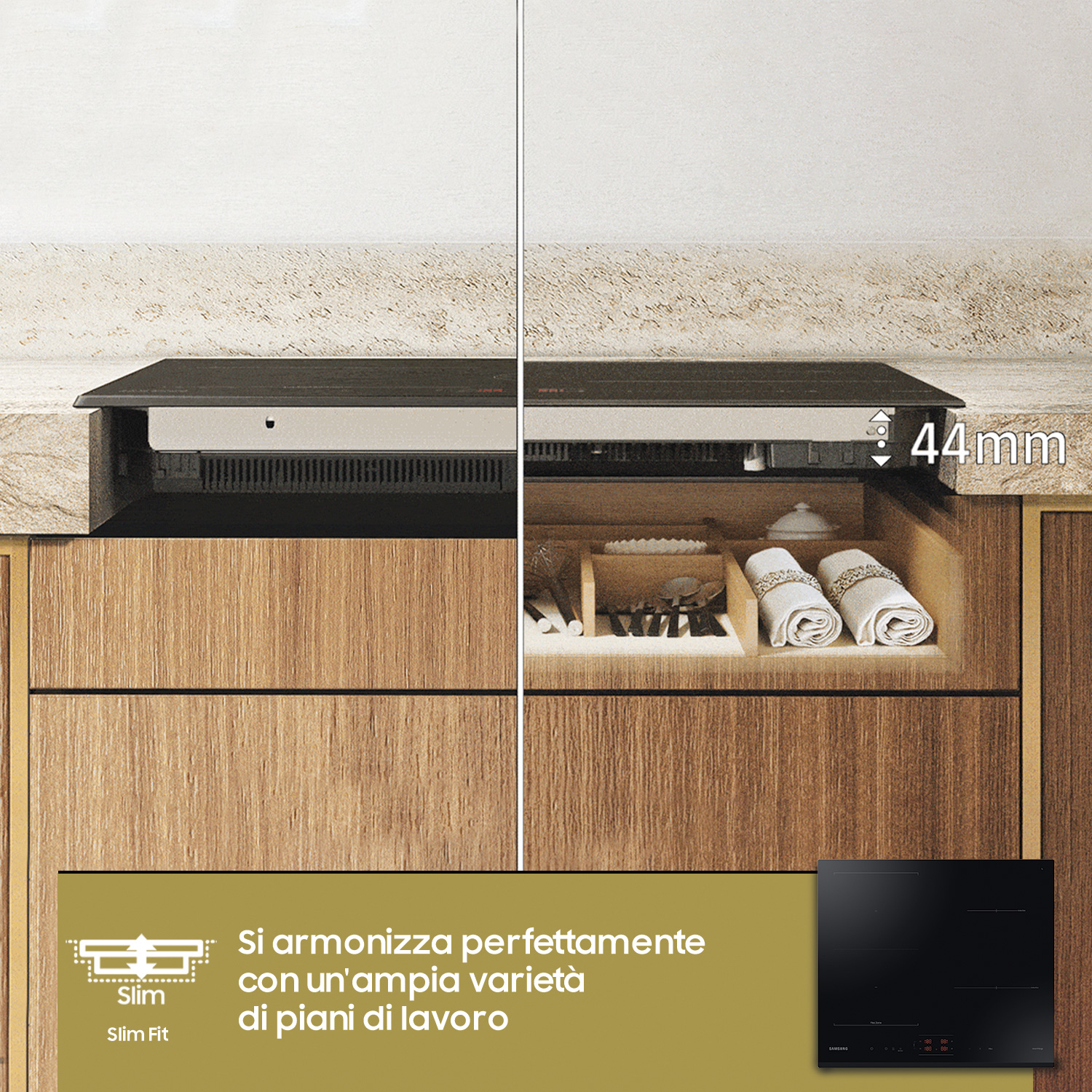 Aggiungi un’utile capienza extra alla tua cucina*. Il design slim fit del piano cottura si armonizza perfettamente con un’ampia varietà di piani di lavoro, a prescindere dal loro spessore. E questo significa che hai più spazio per un cassetto più largo e che è più facile da inserire, riducendo i tempi e i costi di installazione.