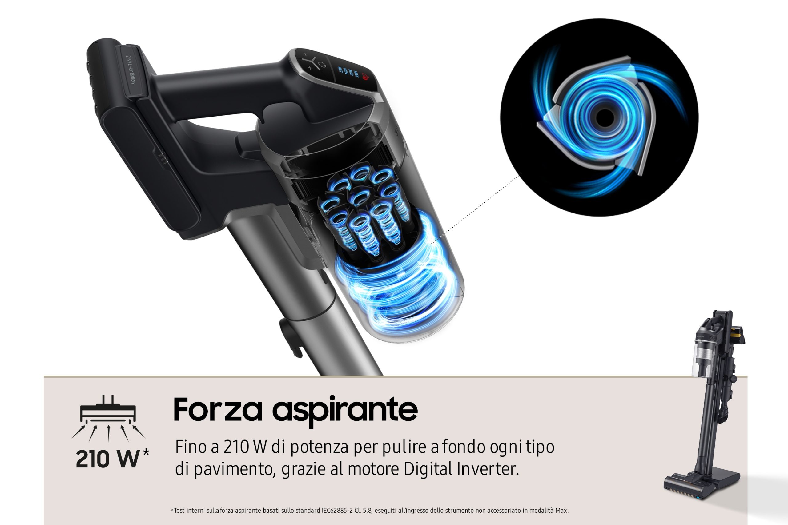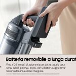 Pulisci la tua casa senza sforzo e con il massimo controllo. Il design ultraleggero assicura la massima praticità e riduce il rischio di traumi al polso. Il corpo della scopa pesa appena 1,44 kg, l’11% in meno[10] rispetto ai tradizionali aspirapolvere Samsung. In questo modo puoi pulire facilmente tutta la casa.