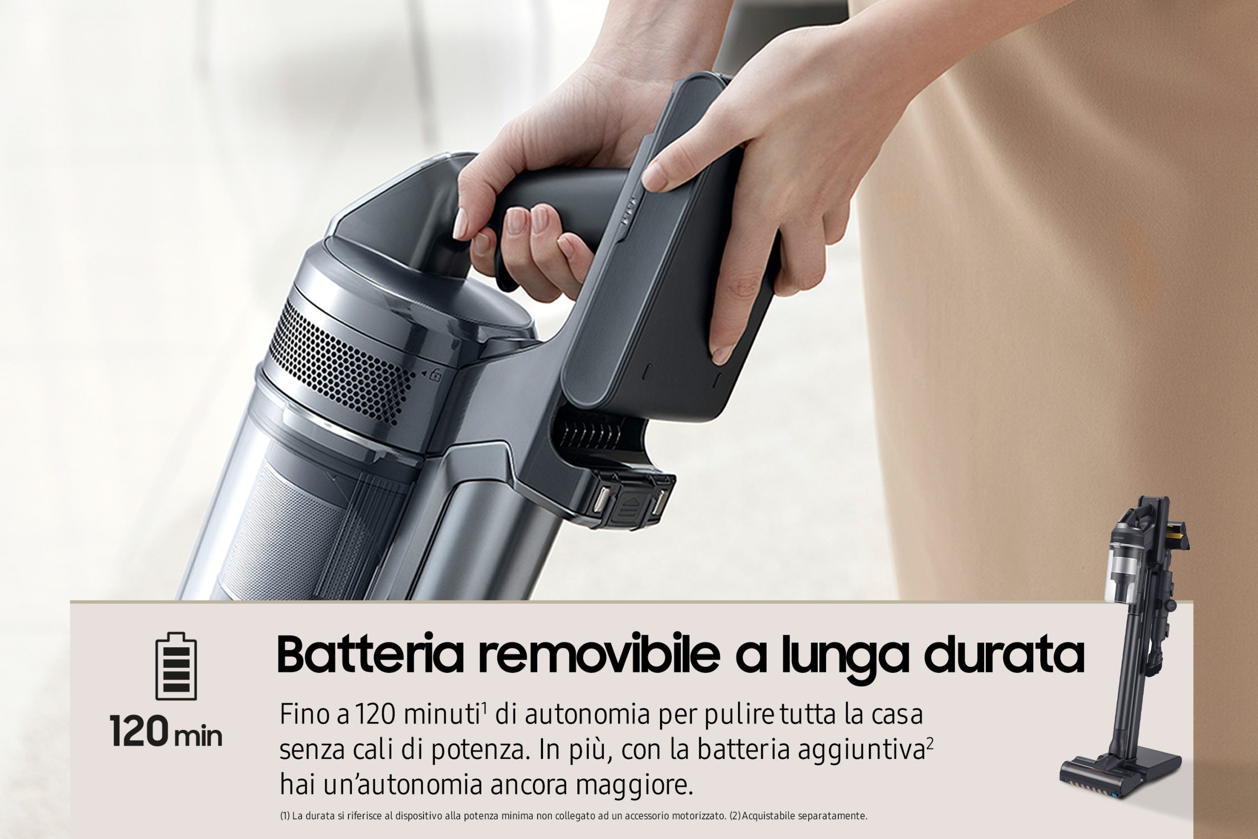 Grazie alle 2 batterie incluse ad elevata capacità, che garantiscono fino a 120 minuti di autonomia[11] , potrai dedicarti alle pulizie di casa più a lungo senza bisogno di ricaricare laspirapolvere. La batteria, inoltre, conserva il 70% delle prestazioni iniziali anche dopo 500 cicli[12] ed è coperta da una garanzia di 2 anni[13].