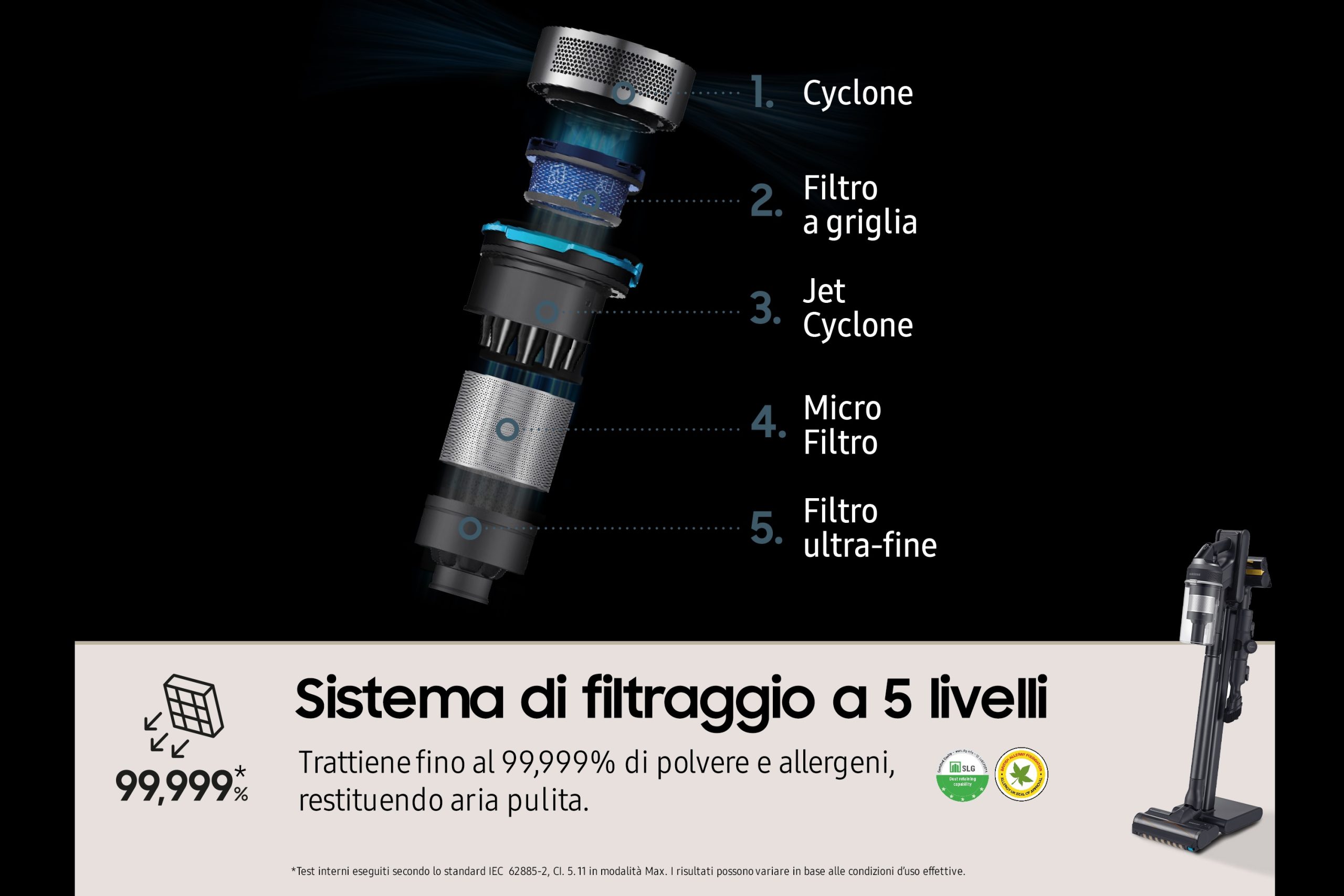 Lo speciale sistema di filtraggio multistrato trattiene fino al 99,999%[7] della polvere[8] e riduce lesposizione agli allergeni di origine animale[9] , per emettere solo aria pulita. Mentre il filtro ciclonico e la griglia in maglia metallica trattengono le particelle più grossolane, il sistema Jet Cyclone e il micro-filtro pensano alle particelle più piccole. Il filtro per le polveri ultra-sottili completa lopera[8].
