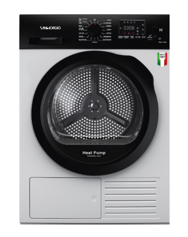 SanGiorgio SDR9I. Posizionamento dell’apparecchio: Libera installazione, Tipo di carica: Caricamento frontale, Sistema di asciugatura: Pompa di calore. Capacità cestello: 9 kg, Condensation efficiency class (old): A, Classe di efficienza della condensazione: B. Partenza ritardata: 24 h, Avvio ritardato (min): 1 h. Classe efficienza energetica: C, Consumo energetico: 1,06 kWh, Consumo energetico annuo: 1,06 kWh. Profondità: 630 mm, Larghezza: 596 mm, Altezza: 844 mm