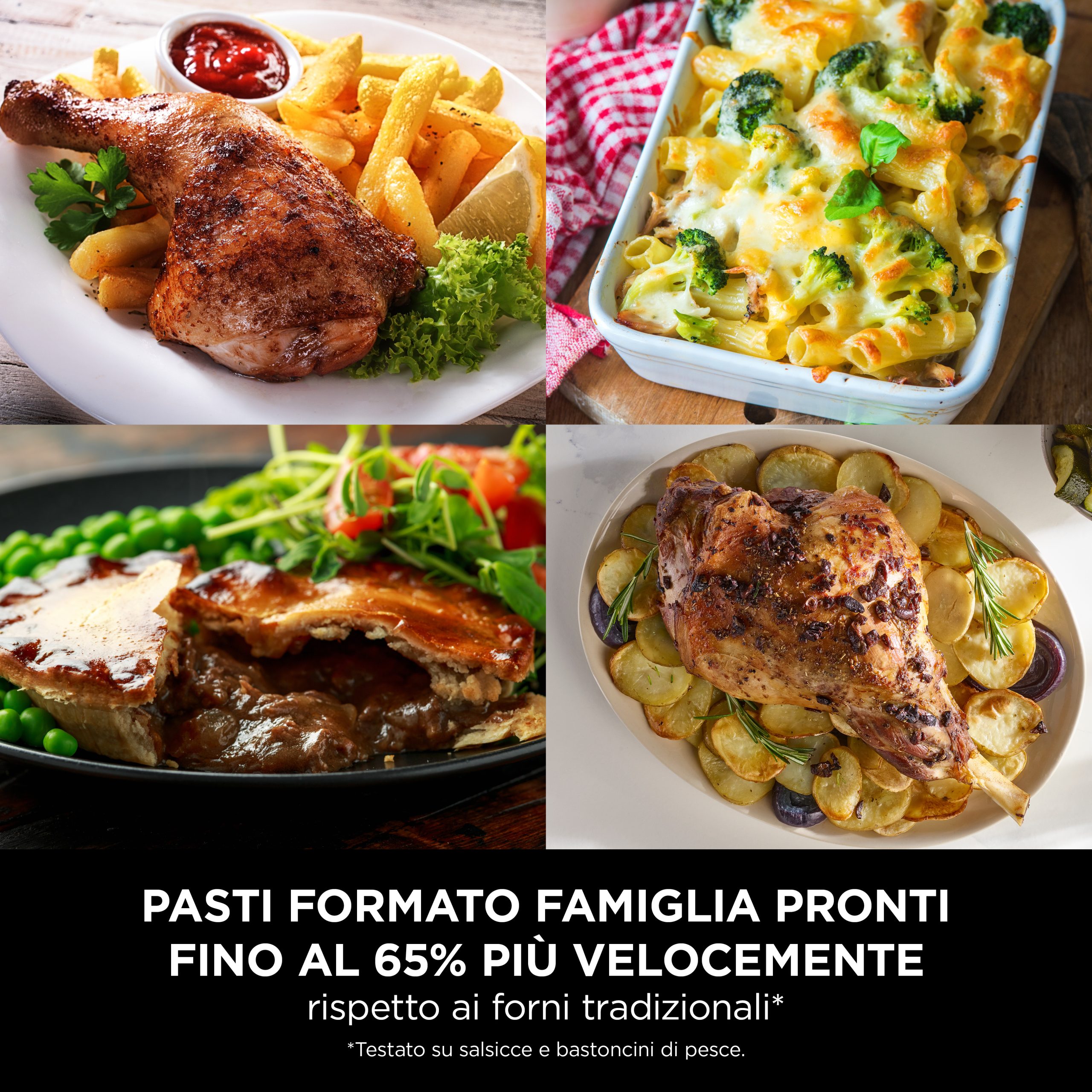 Fino al 65% più veloce rispetto ai forni ventilati*, per avere menu completi pronti in meno della metà del tempo.