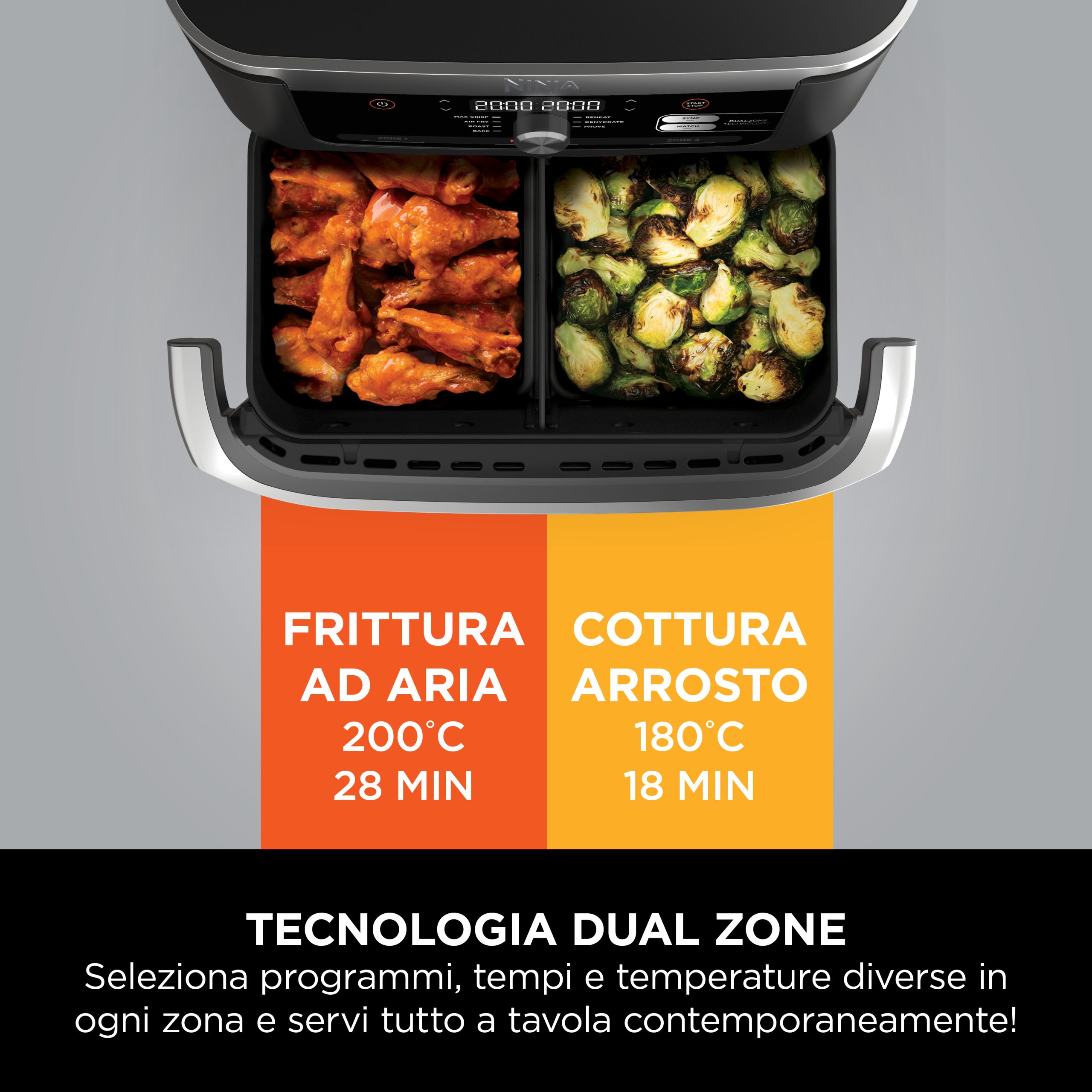 La tecnologia Dual Zone di Ninja ti consente di cucinare con 2 funzioni, tempi e temperature diverse per zona e avere tutto pronto contemporaneamente!