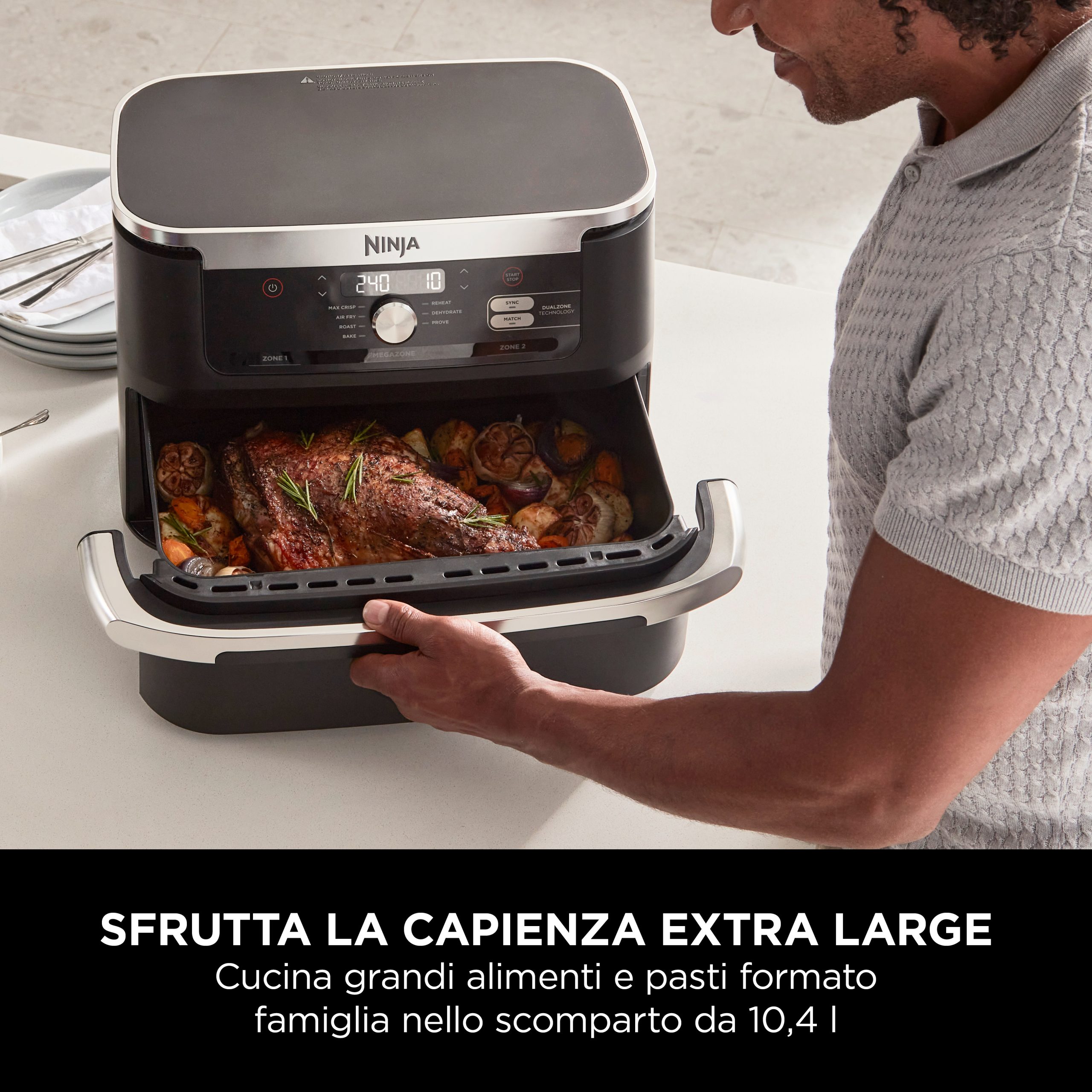 Cuoci alimenti di grandi dimensioni nella MegaZone da 10,4 l oppure utilizza il divisorio per creare 2 zone di cottura indipendenti e combinare a piacimento le funzioni di cottura grazie alla tecnologia Dual Zone di Ninja.