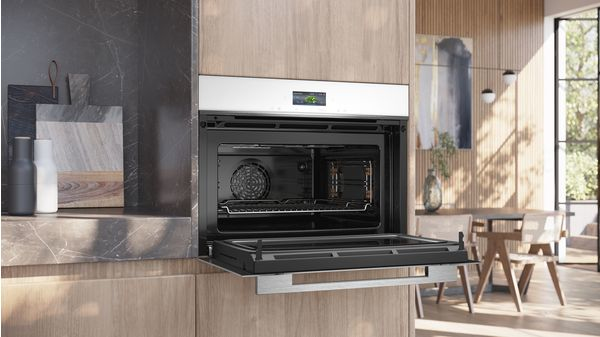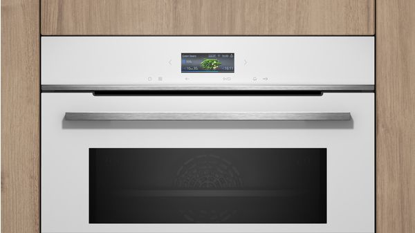 Siemens iQ700 CM724G1W1. Dimensione del forno: Media, Tipo di forno: Forno elettrico, Capacità interna forno totale: 45 L. Posizionamento dell’apparecchio: Da incasso, Colore del prodotto: Nero, Bianco, Tipo di controllo: Touch. Tipo di orologio: Elettronico, Applicazioni per il controllo supportate: Home Connect. Carico di collegamento: 3600 W, Tensione di ingresso AC: 220 – 240 V, Frequenza di ingresso AC: 50 Hz. Tipo di lampada: LED