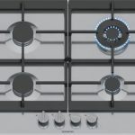 Piano cottura a gas in acciaio inossidabile con tecnologia stepFlame per un controllo preciso della fiamma, manopole magnetiche removibili e griglie continue per una facile pulizia.