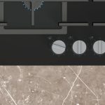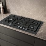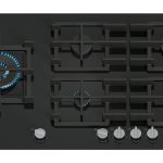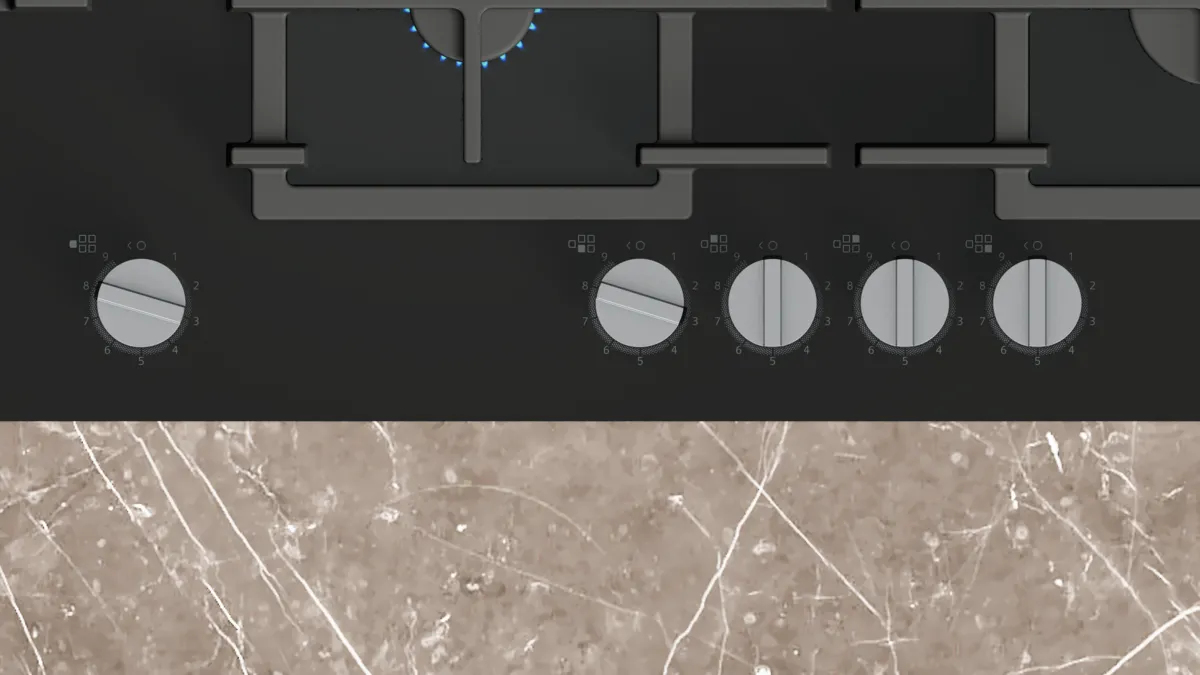 Piano cottura a gas in vetro temperato con tecnologia stepFlame per un controllo preciso della fiamma, manopole magnetiche removibili e griglie semi-continue per una facile pulizia.