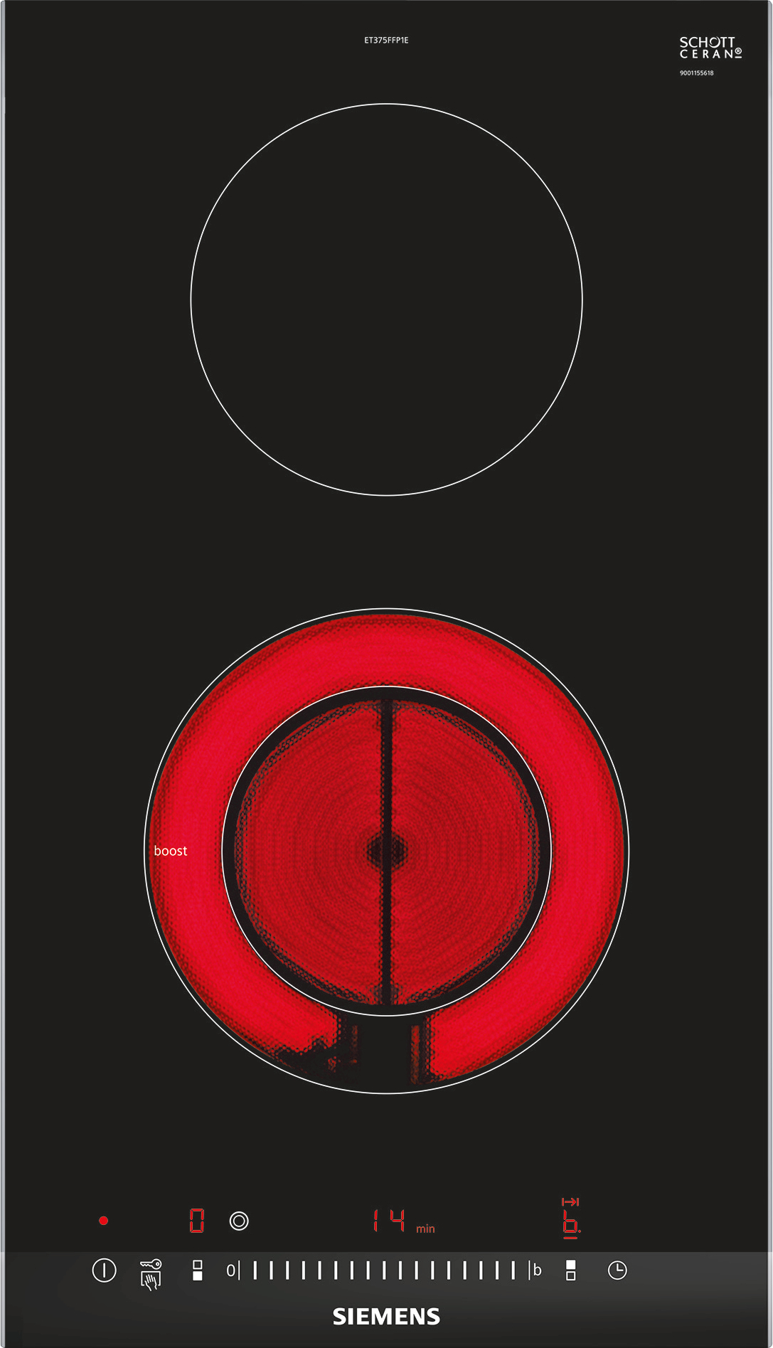 Siemens ET375FFP1E. Colore del prodotto: Nero, Acciaio inox, Posizionamento dell’apparecchio: Da incasso, Tipo di piano cottura: Ceramica. Bruciatore piccolo: 1200 W, Bruciatore medio: 2000 W, Certificazione: AENOR, CE. Tipo di controllo: Manopola, Posizione di controllo: Frontale superiore. Potenza aggregata (elettrica): 3500 W, Tensione di ingresso AC: 220-240 V, Frequenza di ingresso AC: 50 – 60 Hz. Larghezza: 302 mm, Profondità: 520 mm, Altezza: 38 mm