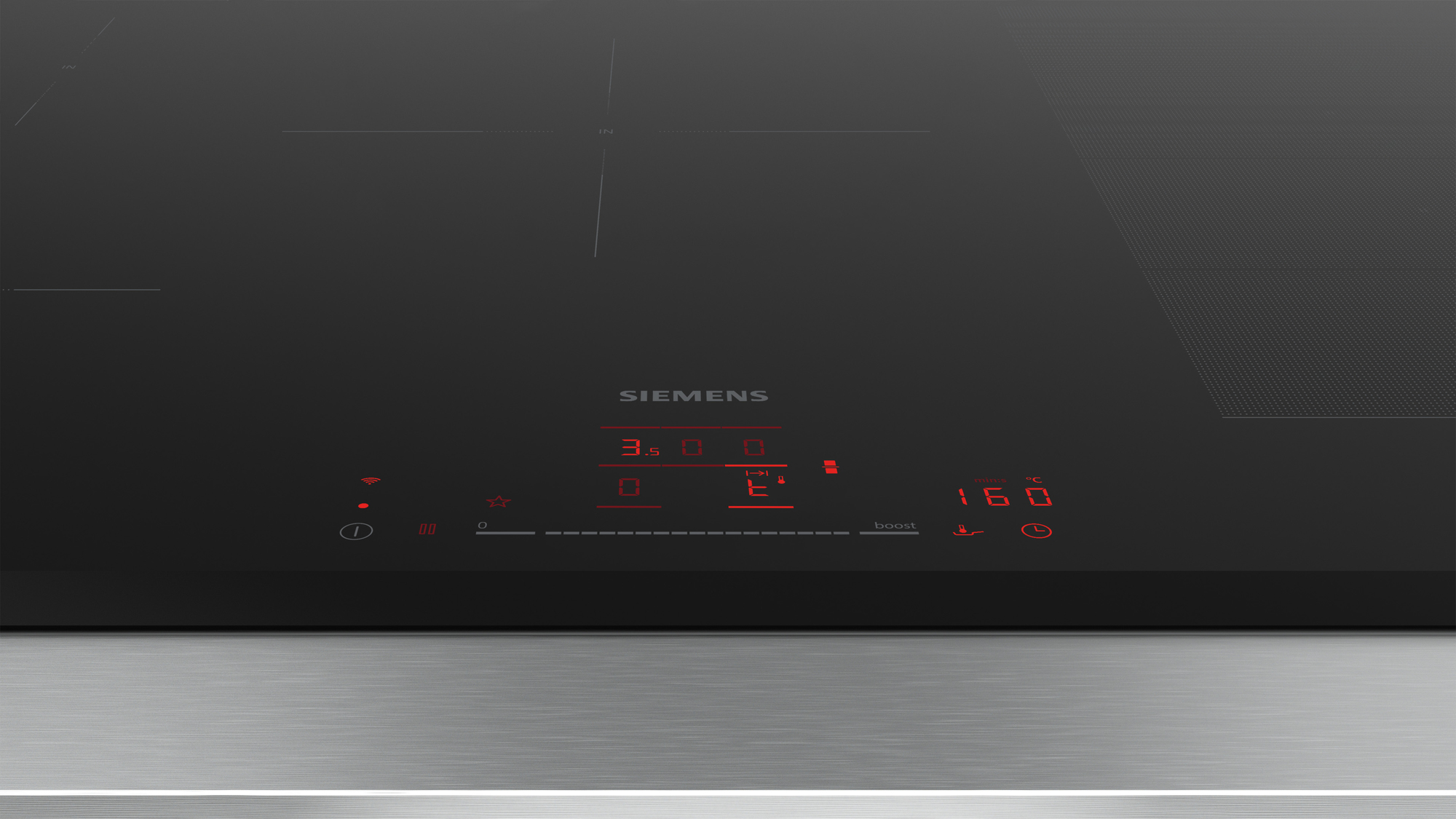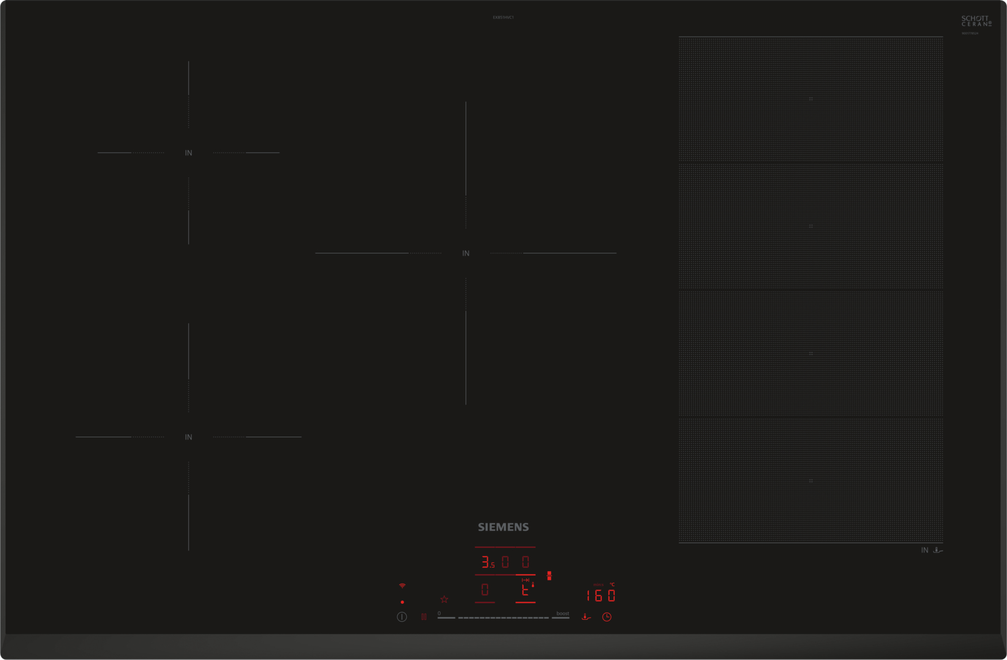 Siemens iQ700 EX851HVC1E. Colore del prodotto: Nero, Posizionamento dell’apparecchio: Da incasso, Dimensione della larghezza del piano cottura: 80 cm. Tipo di controllo: Touch, Posizione di controllo: Frontale, Tipo di orologio: Elettronico. Potenza aggregata (elettrica): 7400 W, Tensione di ingresso AC: 220 – 240 V, Frequenza di ingresso AC: 50 – 60 Hz. Larghezza: 802 mm, Profondità: 522 mm, Altezza: 51 mm. Larghezza imballo: 953 mm, Profondità imballo: 608 mm, Altezza imballo: 126 mm