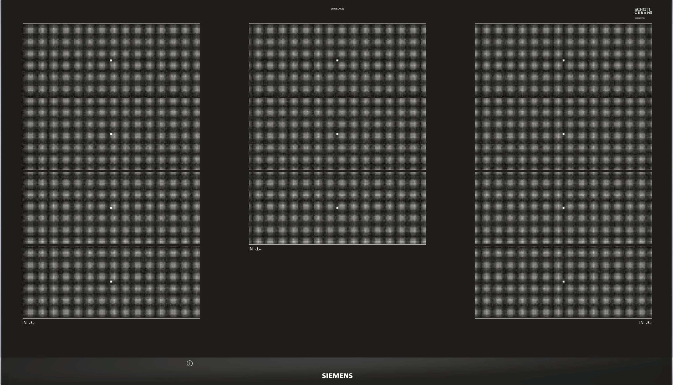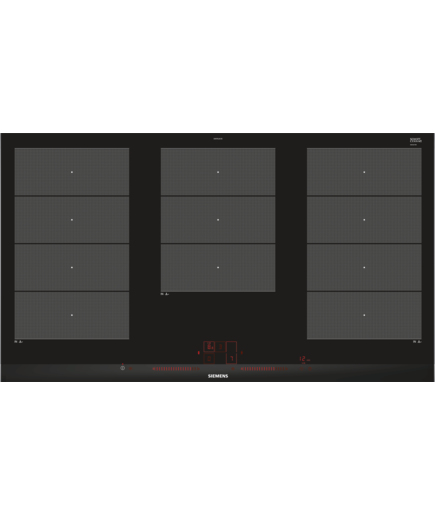 Siemens EX975LXC1E. Colore del prodotto: Nero, Acciaio inox, Posizionamento dell’apparecchio: Da incasso, Tipo di piano cottura: Piano cottura a induzione. Tipo di controllo: Touch, Posizione di controllo: Frontale, Indicatori LED: Potenza. Potenza aggregata (elettrica): 11100 W, Tensione di ingresso AC: 220-240 V, Frequenza di ingresso AC: 50 – 60 Hz. Larghezza: 912 mm, Profondità: 51 mm, Altezza: 520 mm