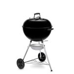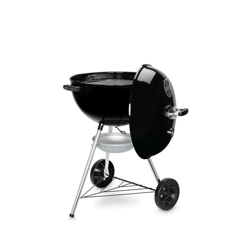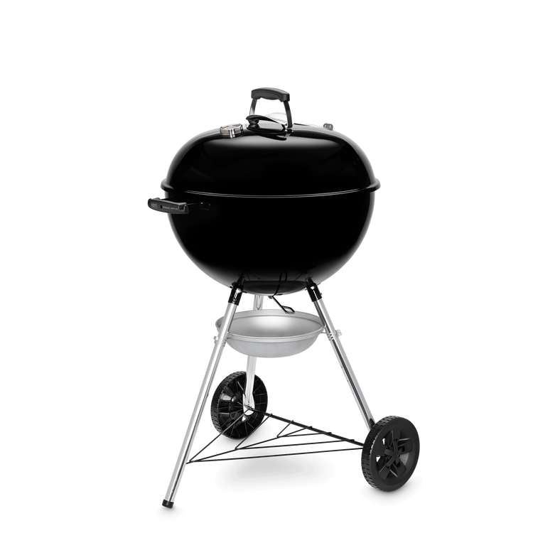 Barbecue a carbone con griglia di cottura da 57 cm. Braciere e coperchio in acciaio smaltato, impugnature in nylon rinforzato con fibre di vetro e valvola d’areazione in alluminio. Griglia di cottura in acciaio cromato, griglia focolare in acciaio. Termometro integrato. Peso 14 Kg.