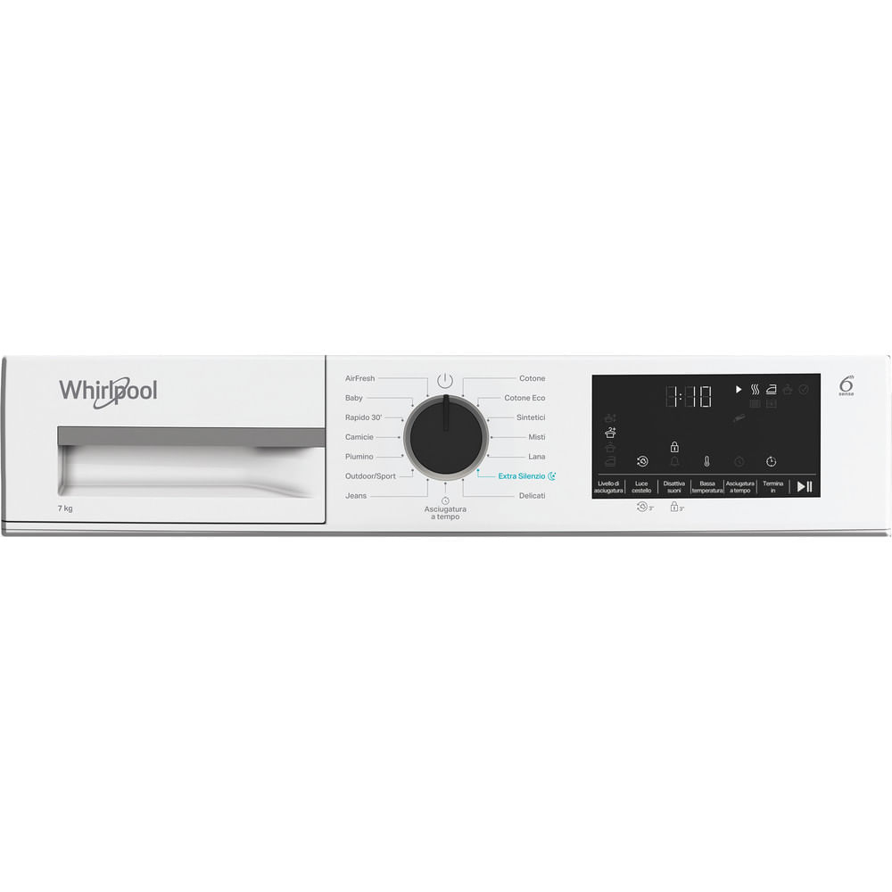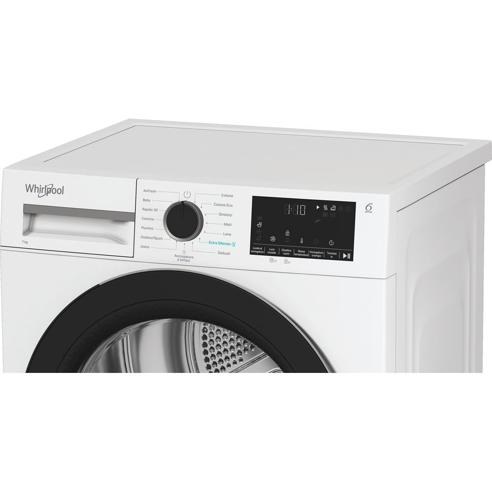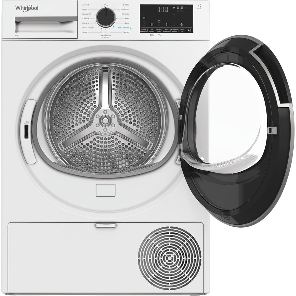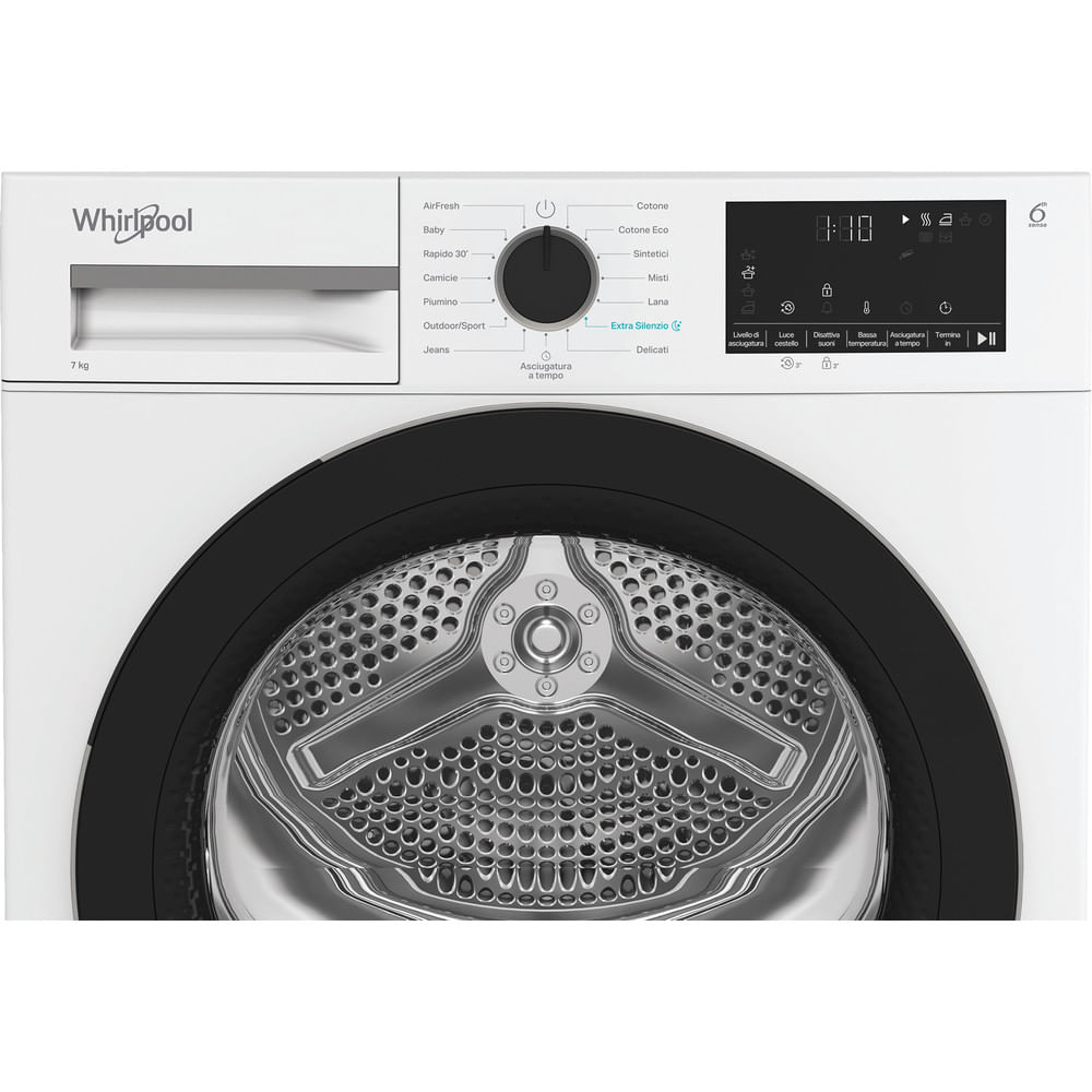 Caratteristiche di questa asciugatrice a libera installazione Whirlpool: cestello spazioso da 7,0 kg. Esclusiva tecnologia 6° SENSO che monitora costantemente il livello di umidità nel tamburo per proteggere i tuoi vestiti e garantire un’asciugatura perfetta. Funzione di connessione che consente all’elettrodomestico di ricevere informazioni riguardo il ciclo di lavaggio utilizzato e regolare le impostazioni di conseguenza per risultati perfetti. Sportello dal design elegante con schermo di sicurezza. Tecnologia a pompa di calore riscalda efficacemente l’aria nell’elettrodomestico, riducendo significativamente il consumo energetico.