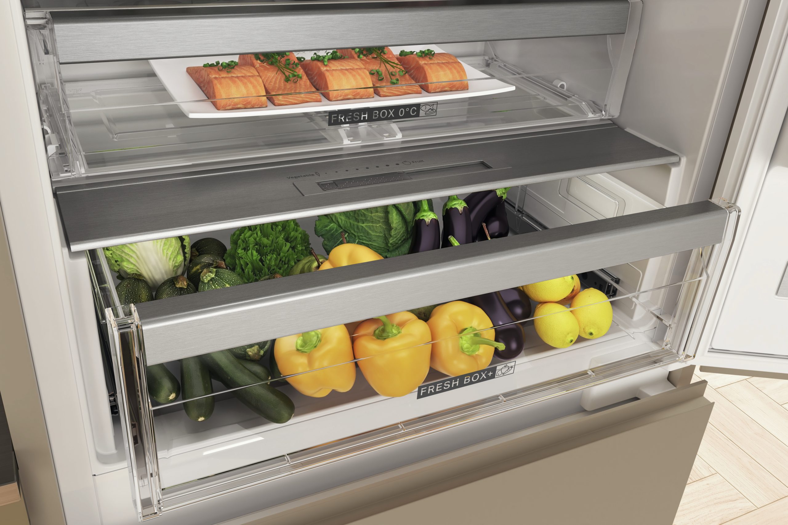 Un cassetto con un cursore per il controllo dell’umidità integrato che consente di conservare frutta e verdura fresche fino a 15 giorni*. *Basato sulla perdita di peso e aspetto visivo considerando frutta e verdura comuni. Procedura di prova interna.