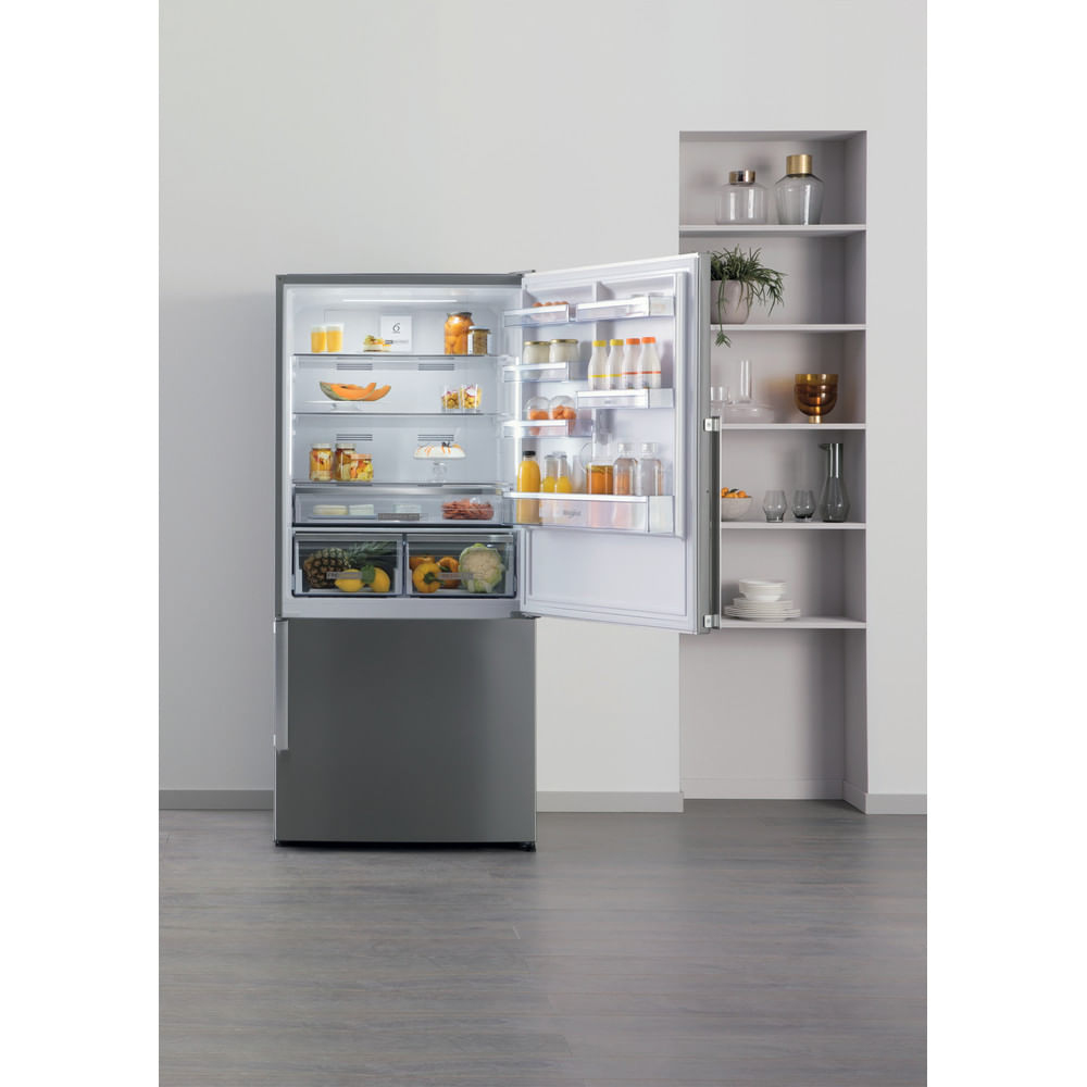 Caratteristiche di questo frigorifero combinato a libera installazione Whirlpool: color inox. Design Inox. No Frost, la tecnologia che previene efficacemente la formazione di ghiaccio nel congelatore riducendo i livelli di umidità. Modello alto e capiente, adatto per le esigenze di tutta la famiglia. Ripiani in vetro, robusti ed eleganti al tempo stesso.